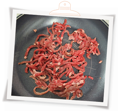 소고기, 홍파프리카, 청피망, 양파, 볶음소스, 꽃빵