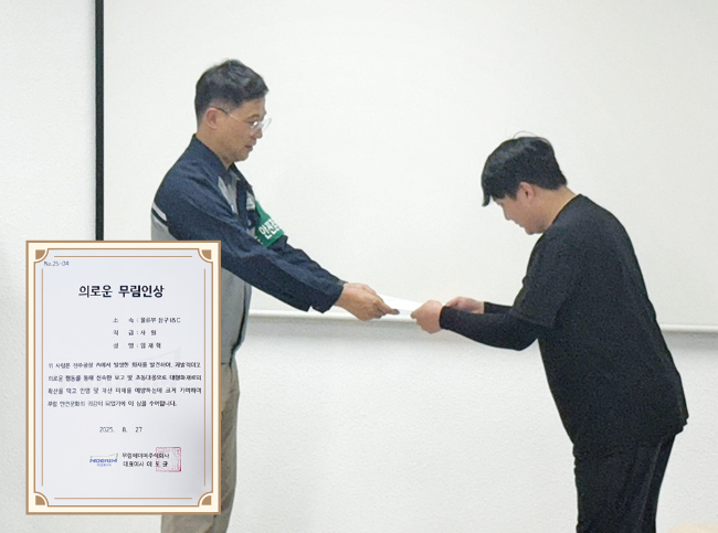 무림페이퍼 진주공장 임재혁 사원이 8월 27일 ‘의로운 무림인상’을 수상했다. 임재혁 사원은 지난 7월 21일 현장에서 발생한 화재를 발견하고 신속한 초동대응으로 대형 화재로의 확산과 인명 피해를 예방하는 데 크게 기여해 ‘의로운 무림인’으로 선정됐다. 무림페이퍼 조재천 안전센터장은 시상식을 통해 상장과 함께 포상금 30만 원을 수여했다. 임재혁 사원은 “누구라도 했을 일”이라며, “감사한 마음을 잊지 않고 늘 안전을 최우선으로 여기며 업무에 임하겠다”라고 말했다.
