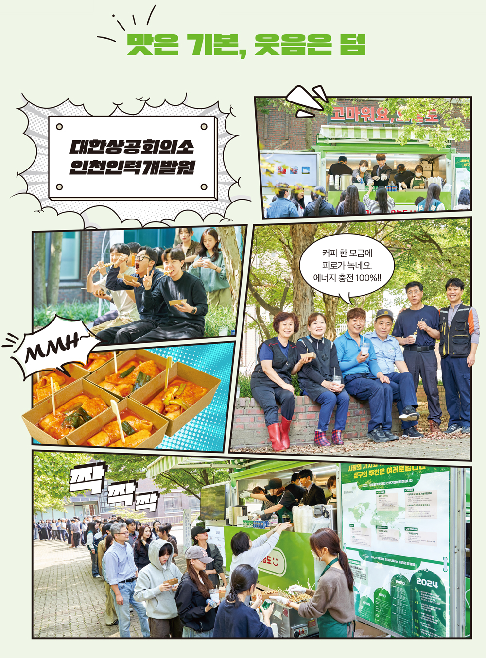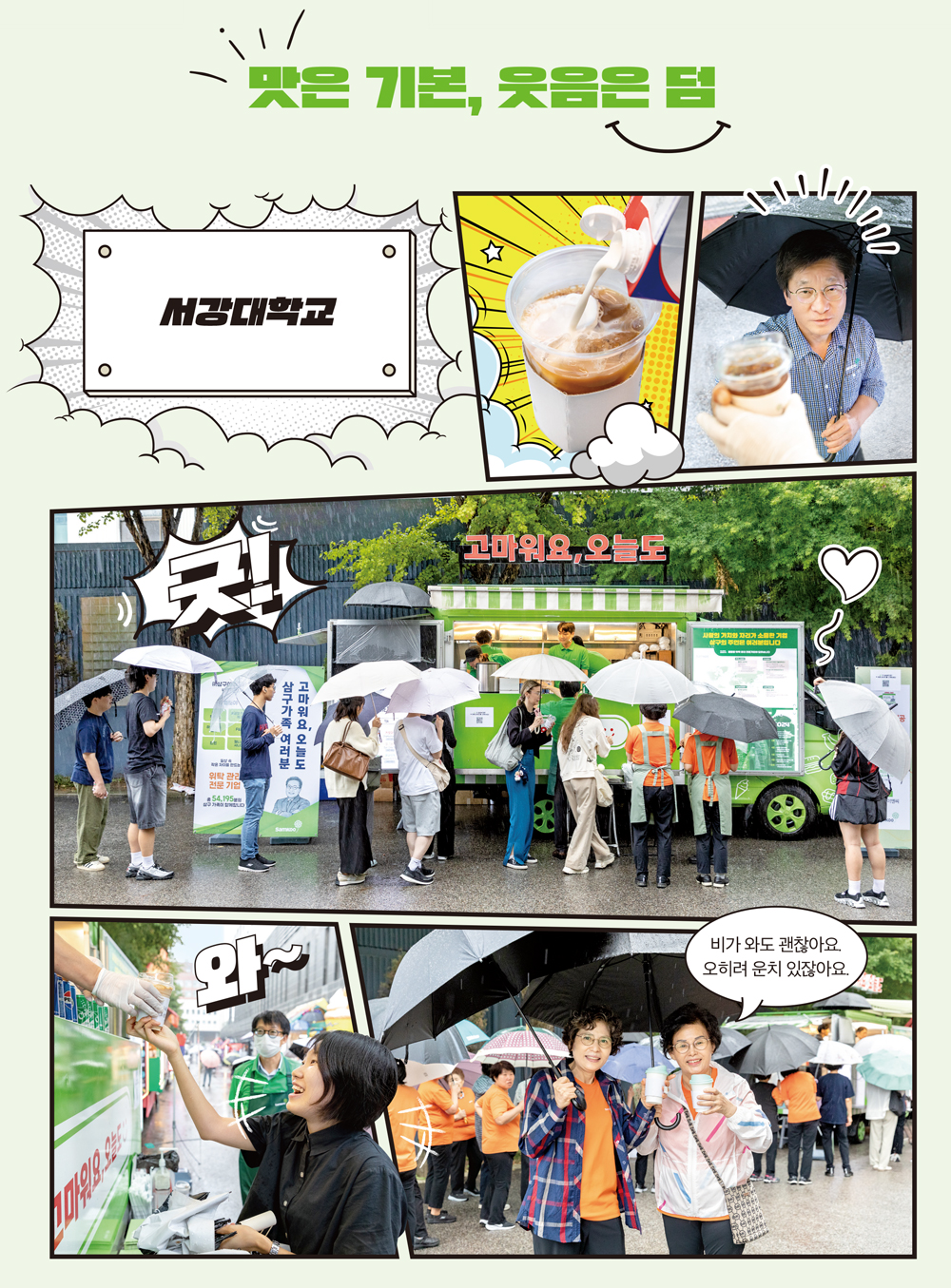 삼구 愛樂 고마워요, 오늘도 푸드트럭은 서강대학교의 축제 현장과 대한상공회의소 인천인력개발원에서 삼구 구성원과 청춘들을 만났다. 궂은 날씨도 아랑곳하지 않고 맛있는 향기로 물든 두 현장의 사람들에게는 행복한 미소가 가득 어려 있었다. 삼구문예 인생 한 컷